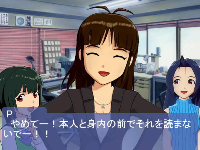 「twitterやってください」 という、とてもありがたいコメントがあったのですが、 ごめんなさい。twitterは以前までやってましたが、 現在アイマス界隈は、肯定派と否定派が血で血を洗う内戦状態。 私は肯定派の方の「否定派は黙れ」というTLを見たりするのが辛くなったので、 (肯定派の方の「黙れ」というTLは御自身も、「アイマス2楽しみだぜ!」っていう発言を自粛しないとフェアじゃないですよ) 以前のアカウントを削除して、現在新しいアカウントで数名のPさんと友人のTLだけ見ている状態です。 なので、その代わりにブログの更新頻度でも上げようかなぁと思います。 あ、ちなみに前のアカウントでは顔写真アップしたこともありました。 近況ですが、年末年始から働き通しでして、今年の正月は実家に帰ることが許されず、一人でさみしく雑煮作ったりしてたのですが、なんか心身ともに色々と無理がたたったようで、この数日間、重い風邪でぶっ倒れてました。なんか、風邪の諸症状が日替わりで来てました。 本当にやばくなると横になることしか出来ないんですね。 いやー、やりたいことは山のようにあるのに。 こっそり書いておきますと、「アイマス上京物語 876編」というのをやりたくて、 今大体イメージに浮かんでいるのは、 765プロに小次郎が来てから一年、 業界内で敏腕プロデューサーとして知られる彼に ある日、社長が新設された876プロの手助けをするよう指示を出す。 そして、876プロに現れた小次郎が秋月涼を見て一言、 「…君はどうして女装してるんだ?」 (こ、この人は本物だ!)と小次郎の眼力に度肝を抜く876プロの面々。 みたいなイメージがあります。 まあ、足したり引いたりで完成する時には全くの別物になるのでしょうけど。 てか、いつ作れるようになるかわかりませんけど。 アイマス上京物語は26話手前くらいで終わらせるつもりなんですが。 PR |